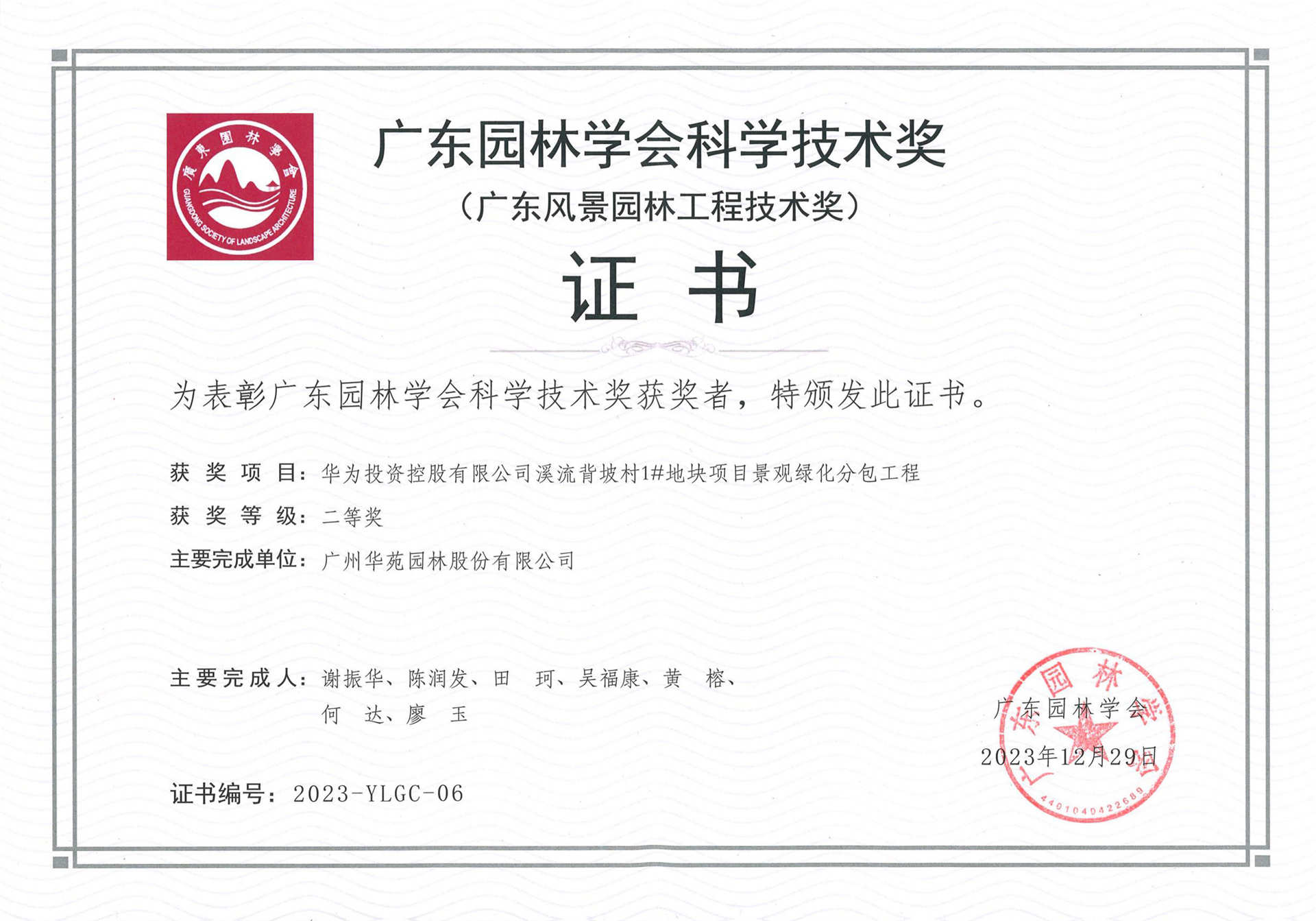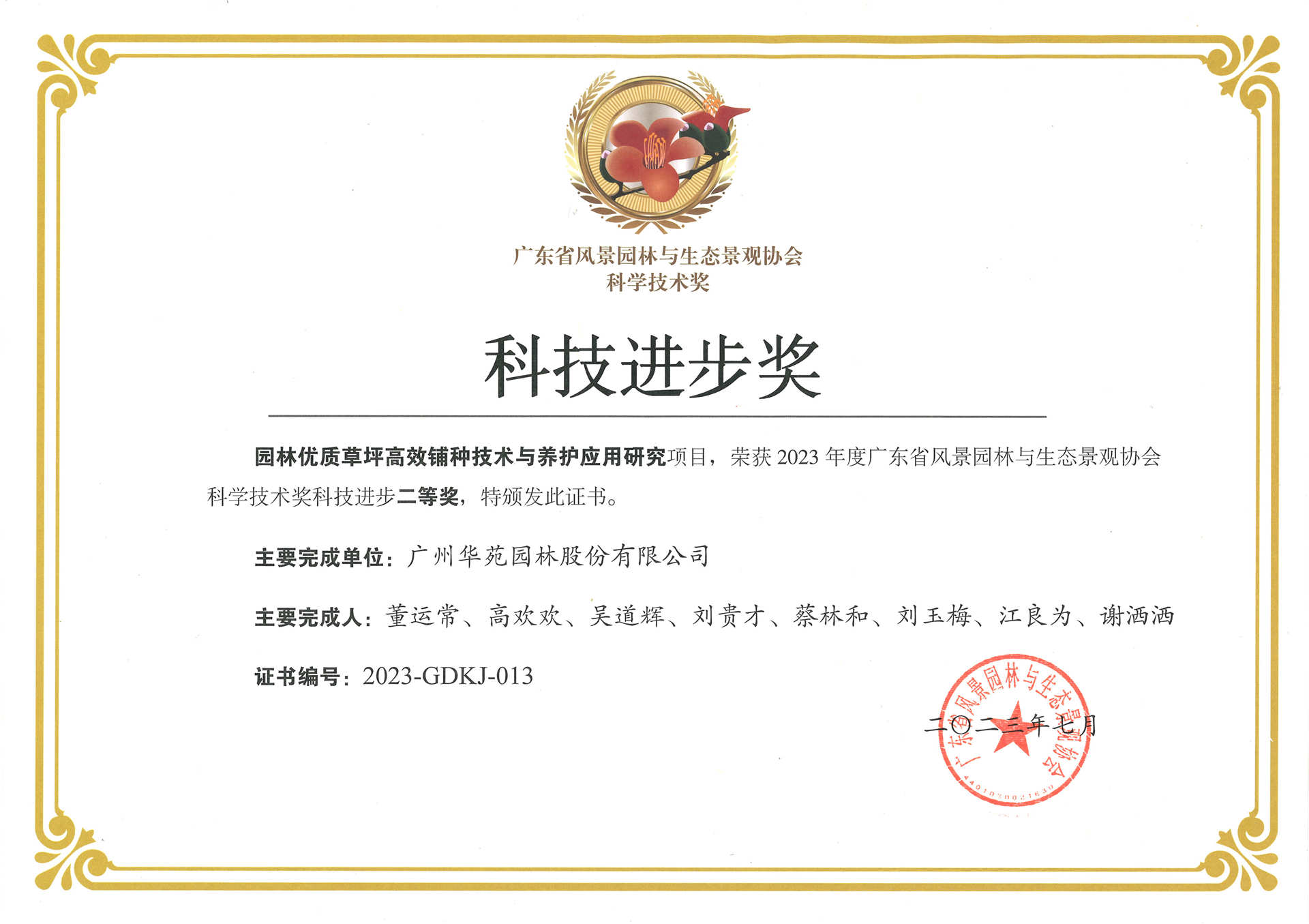 2023年廣東省風(fēng)景園林與生態(tài)景觀協(xié)會(huì)科學(xué)技術(shù)獎(jiǎng)科技進(jìn)步二等獎(jiǎng)——園林優(yōu)質(zhì)草坪高效鋪種技術(shù)與養(yǎng)護(hù)應(yīng)用研究