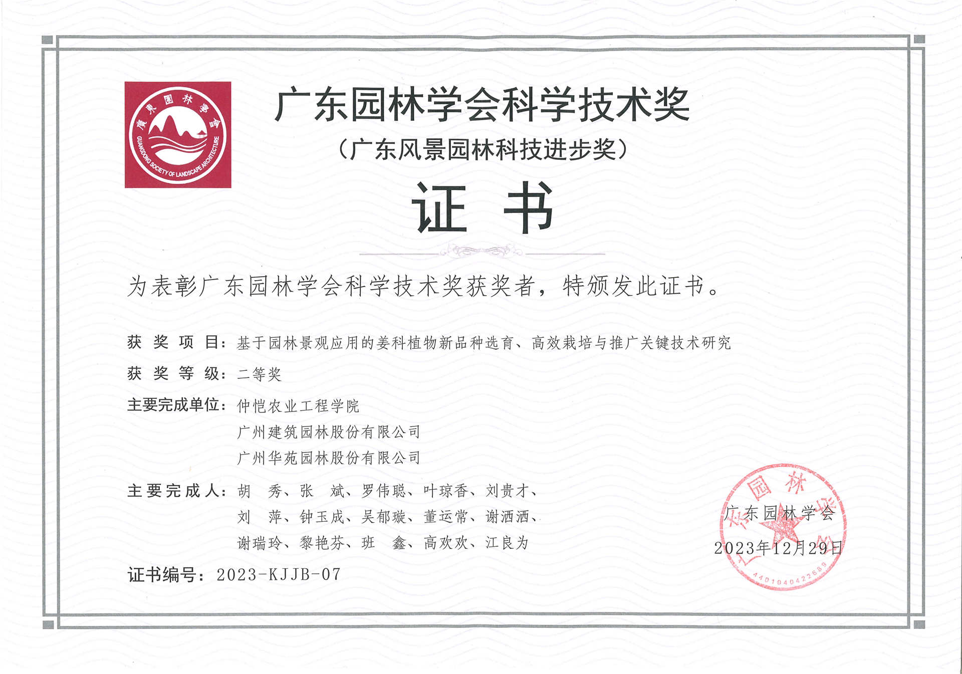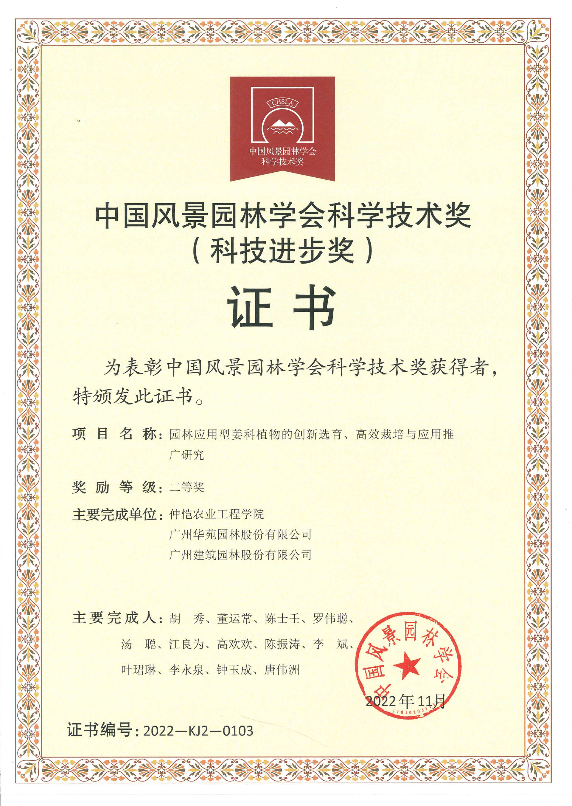 2022年中國(guó)風(fēng)景園林學(xué)會(huì)科技進(jìn)步獎(jiǎng)二等獎(jiǎng)——園林應(yīng)用型姜科植物的創(chuàng)新選育、高效栽培與應(yīng)用推廣研究