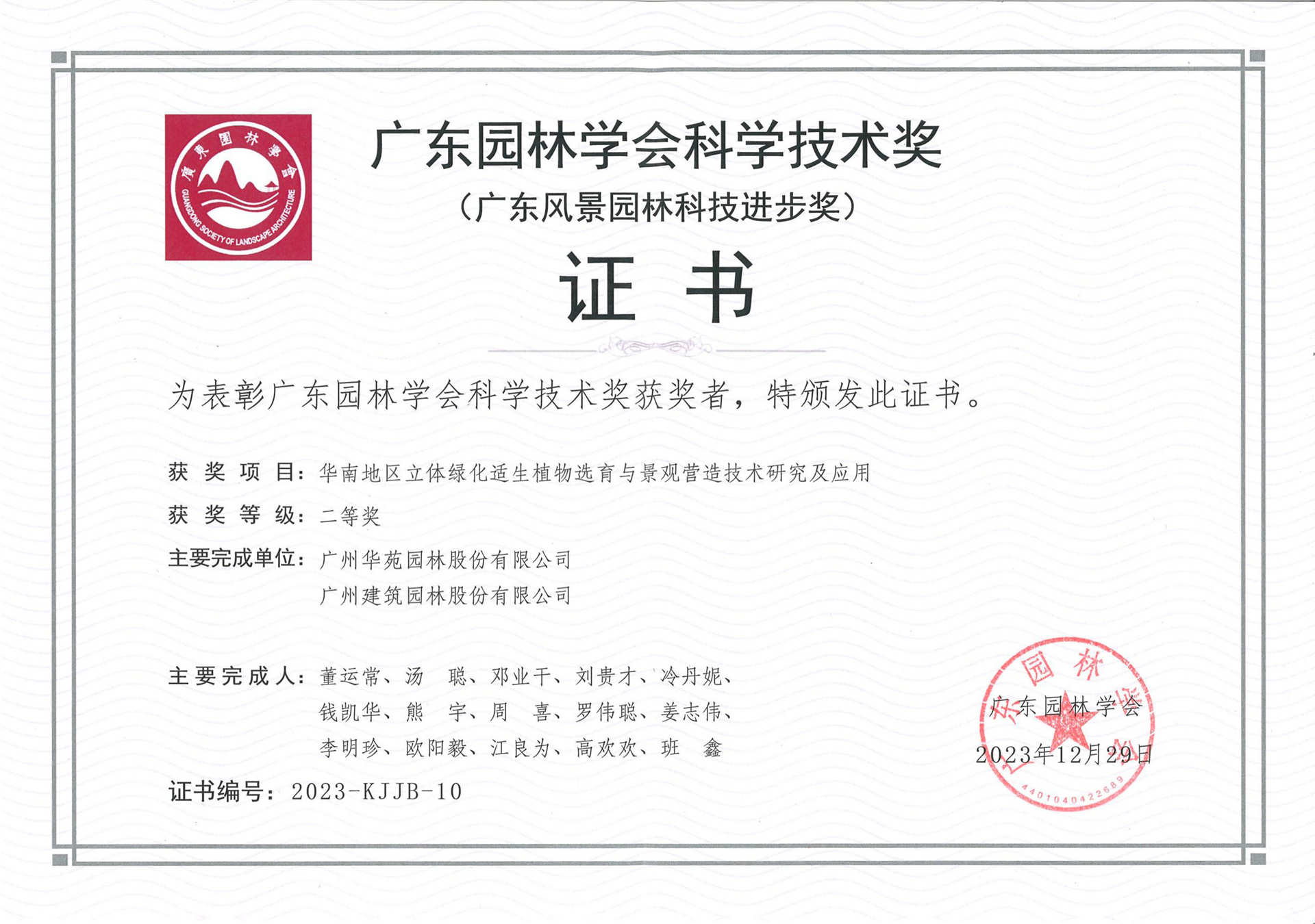 2023年廣東風(fēng)景園林科技進(jìn)步二等獎(jiǎng)——華南地區(qū)立體綠化適生植物選育與景觀營(yíng)造技術(shù)研究及應(yīng)用
