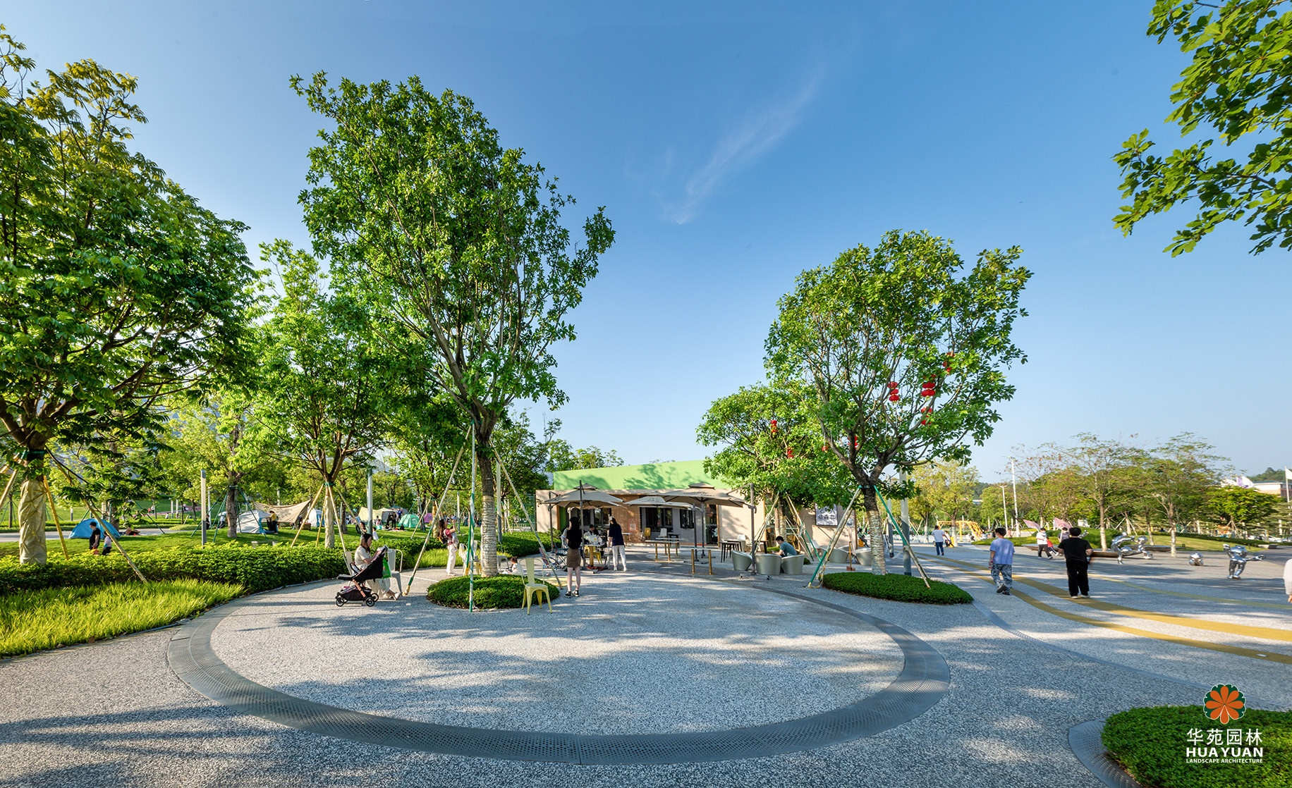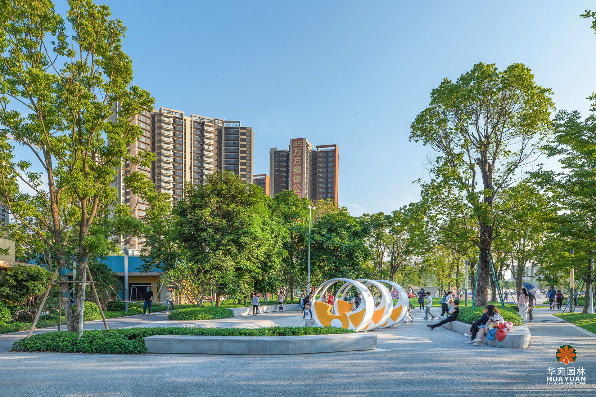 項(xiàng)目的運(yùn)動(dòng)公園區(qū)域秉承“城市舞臺(tái)、活力社區(qū)”的理念,融入奧體精神,提取多種曲線與圓環(huán)元素造景,運(yùn)用豐富的色彩打造多樣活動(dòng)空間,營(yíng)造有活力、有互動(dòng)、有溫度的城市公園。