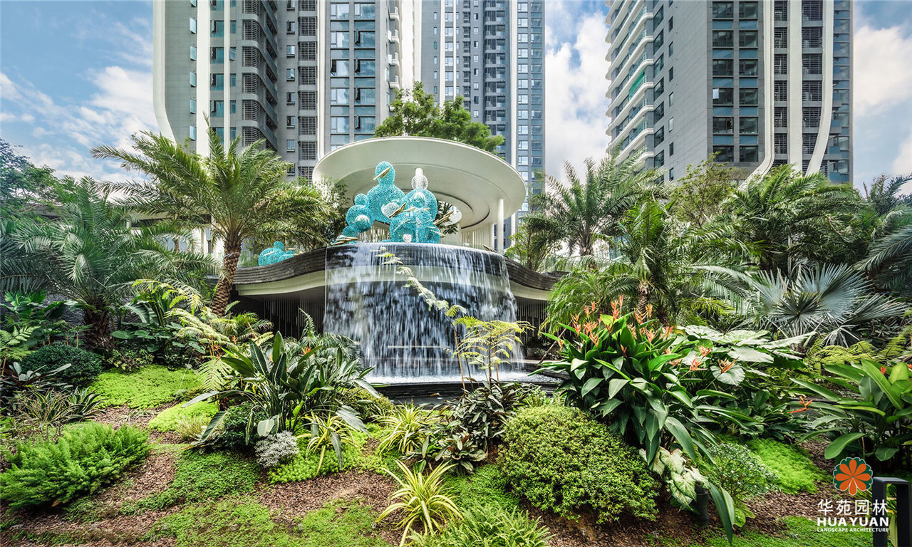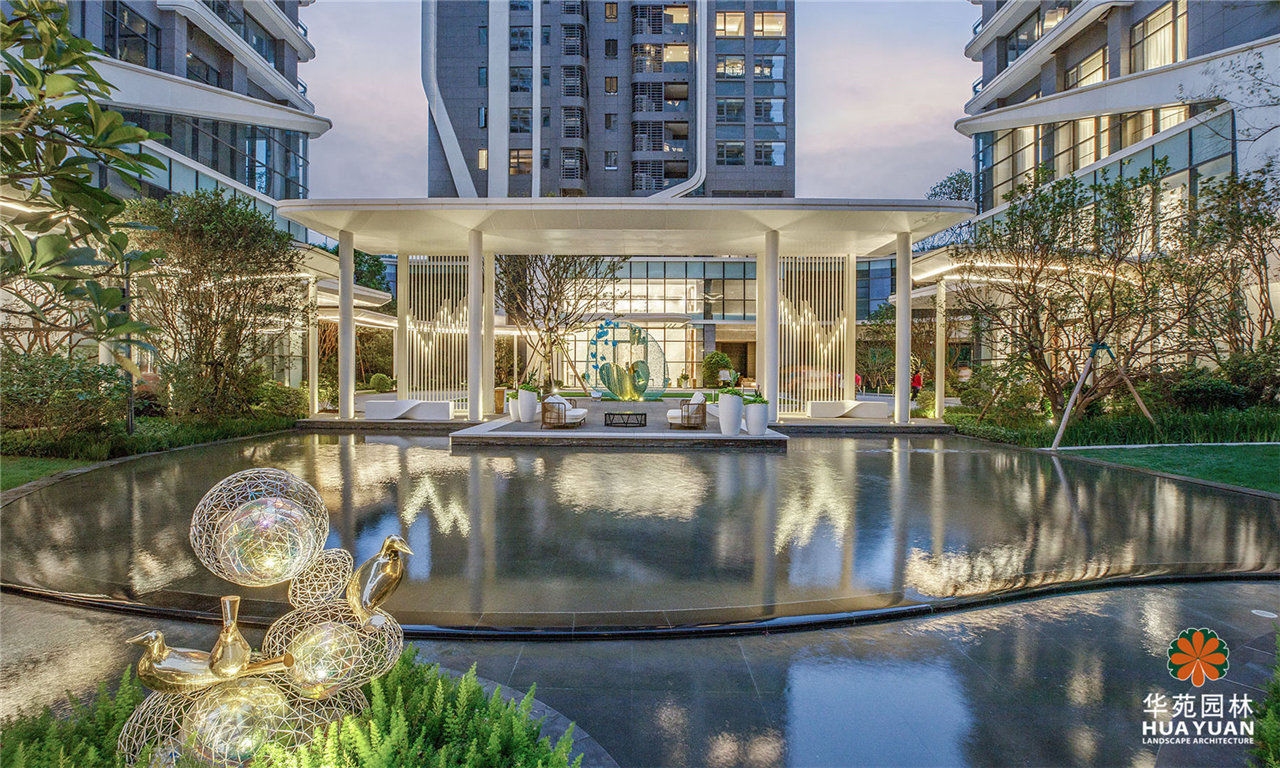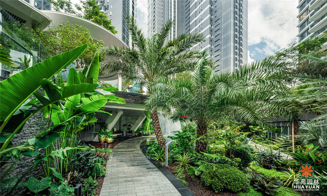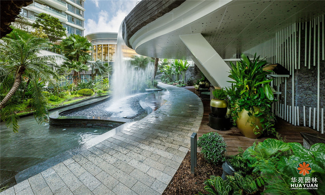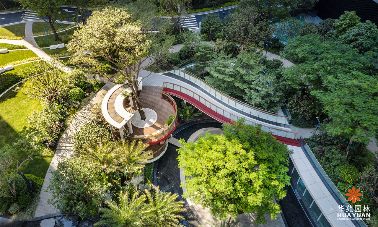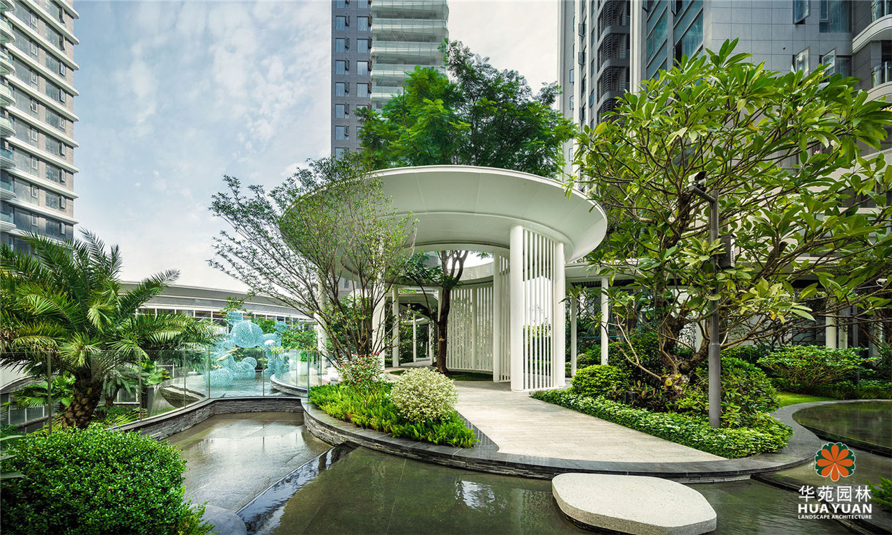 項目采用現代簡約的景觀格調,運用大量弧形線條與豐茂的特色綠植塑造景觀,通過下沉式綠谷布局,打造縱深6米的立體景觀,展現繁華中的自然之境。