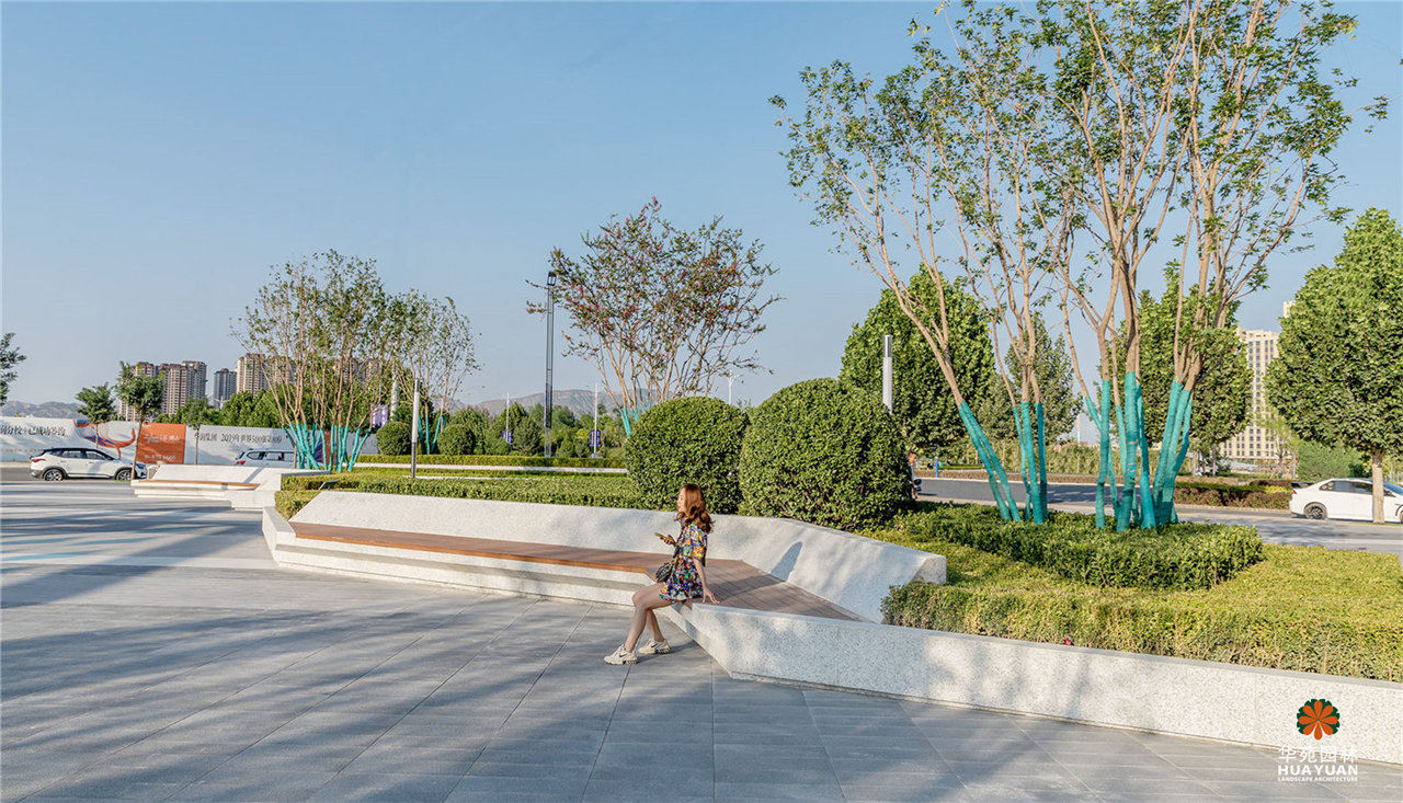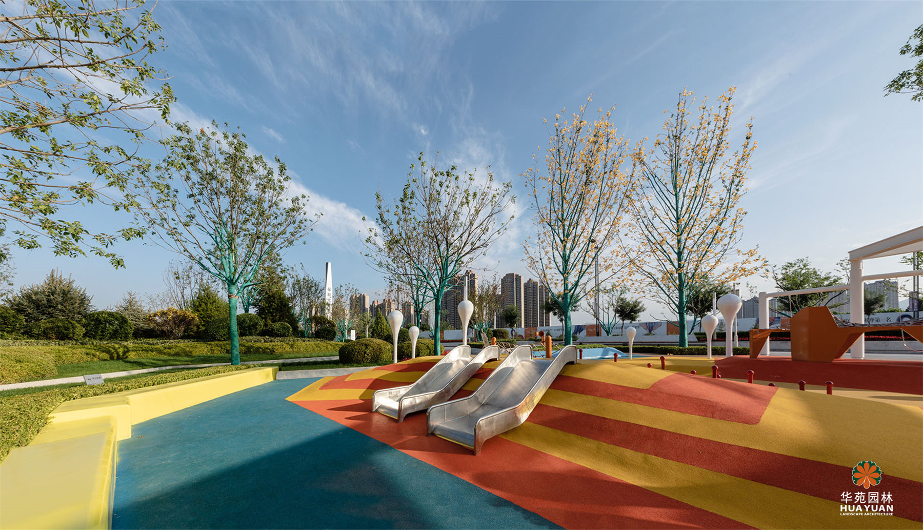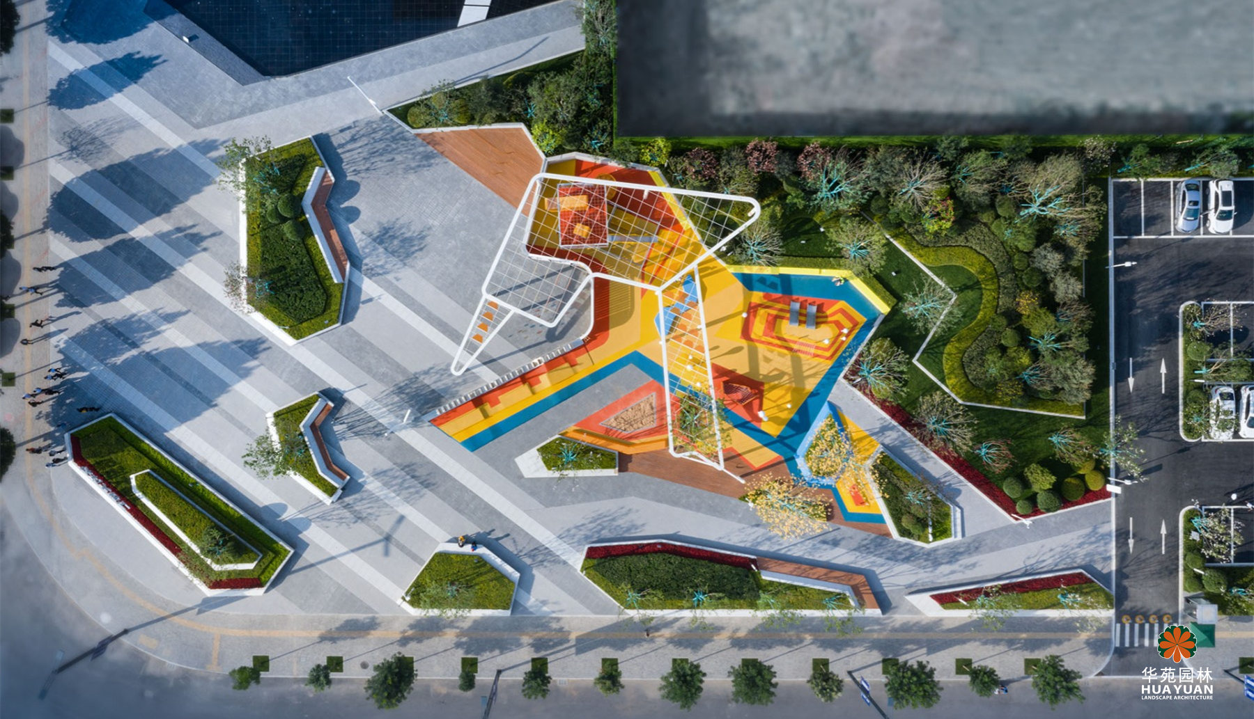 項目采用現(xiàn)代的景觀營造理念,運用形態(tài)多變的折線條塑造全齡參與的多功能場地,色彩豐富的軟景與線條多變的硬景,融合成簡約大氣、充滿活力的景觀空間。