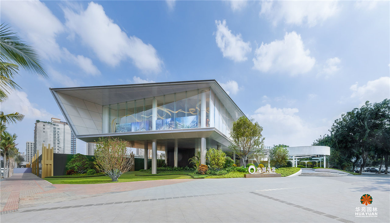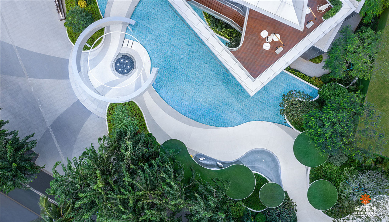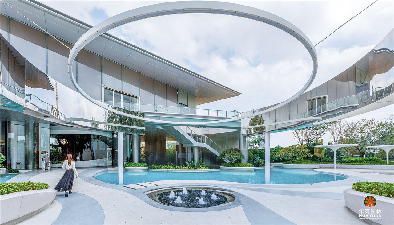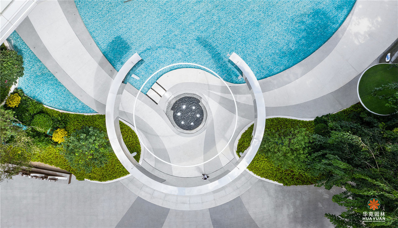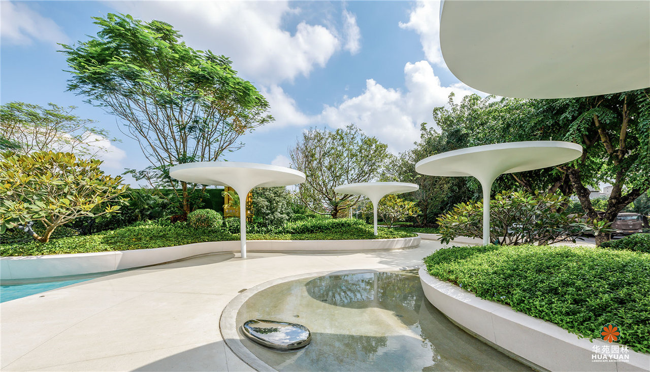 景觀以灰、白、藍(lán)為主調(diào),運(yùn)用多種弧形線條及燈光效果,搭配豐茂的綠植景觀,打造風(fēng)格現(xiàn)代、造型精巧的景觀空間。