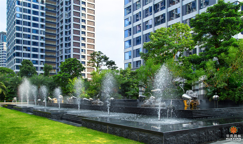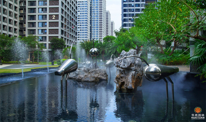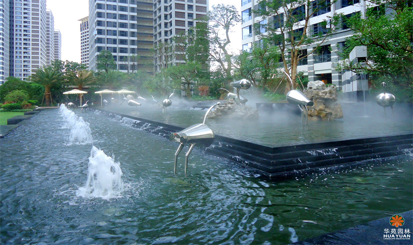 榮獲2015年度中國風景園林學會“園林優(yōu)秀工程金獎” 毗鄰天然濕地公園,福州高端臨江住宅,冷色調鋪裝飾面與幾何流線渾然一體,每次回家都是一次心靈的洗禮;在融合跌水、涌泉等元素的主水景中,自由點綴著太湖石、抽象鶴形雕塑,輔以噴霧效果,使其仿如云煙環(huán)繞,令人自覺置身于世外之吉祥仙境。