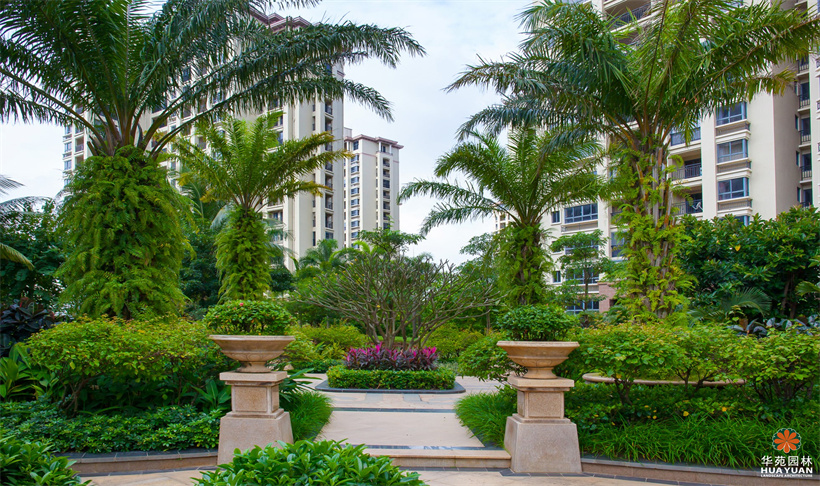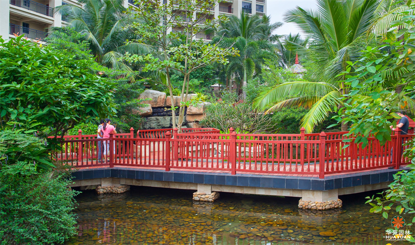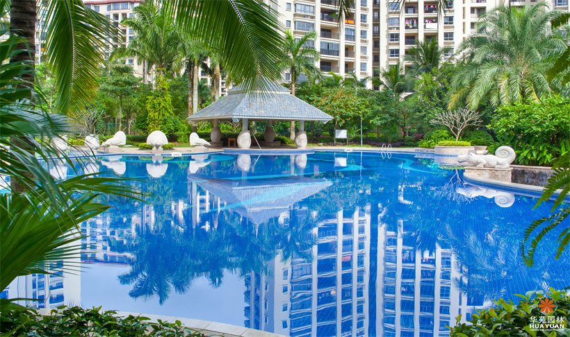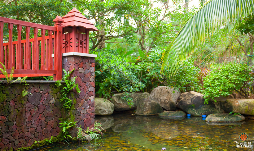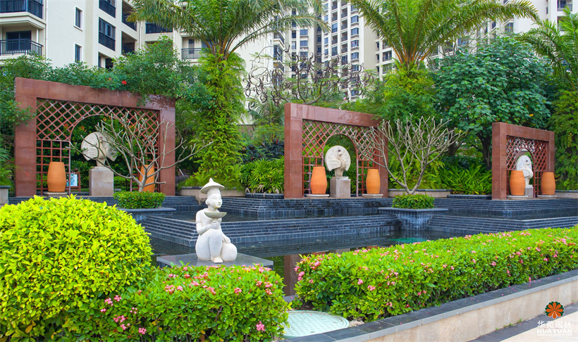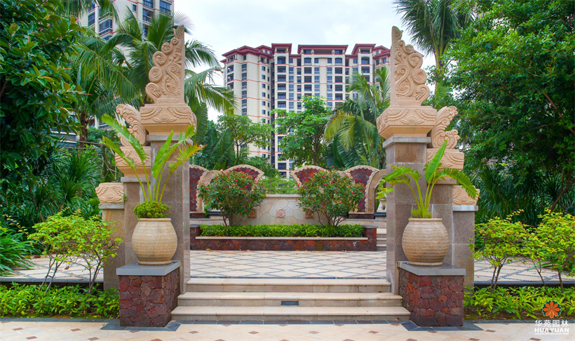 塑石假山群置于自然式水景之上,休憩涼亭的特色瓦頂、乳白色寶瓶柱身與磚紅的庭院燈、青翠的綠植,組合出一幅自然式風(fēng)情畫;池底,兩種不同明度的藍(lán)色馬賽克瓷磚鋪貼而成的圖案,充滿宗教神秘色彩的雕塑小品,造工細(xì)膩的砂巖浮雕,加上蓊郁蒼翠、層次豐富的綠植空間,渲染出濃郁的東南亞園林風(fēng)情。