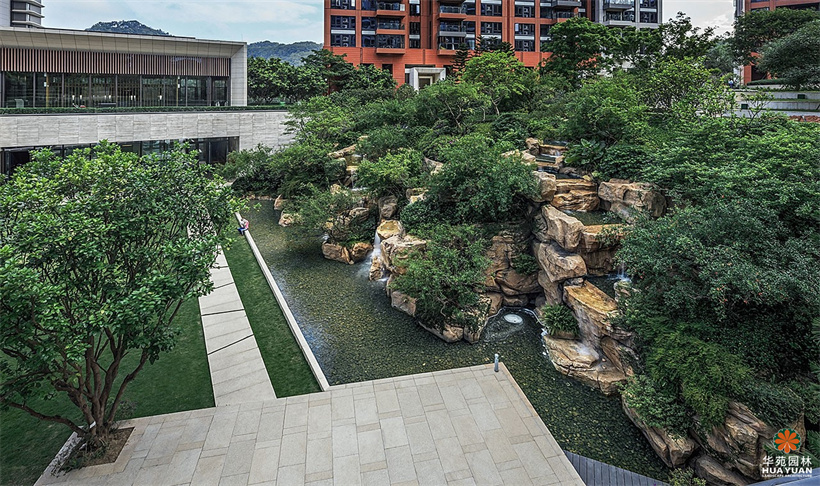 華潤置地打造的城市高端生態(tài)住區(qū)。利用GFRC拓膜技術(shù),高度還原圖紙上7.5米高的塑石假山,再進(jìn)行打磨上色,賦予景石天然的紋路;與繁茂的綠植,潺潺流水,組合出項(xiàng)目特有的銀湖山景。進(jìn)口藍(lán)鉆光面大理石打造的鏡面水景,與園路、草坪置于同一水平面上,形成開敞寬闊的景觀空間。