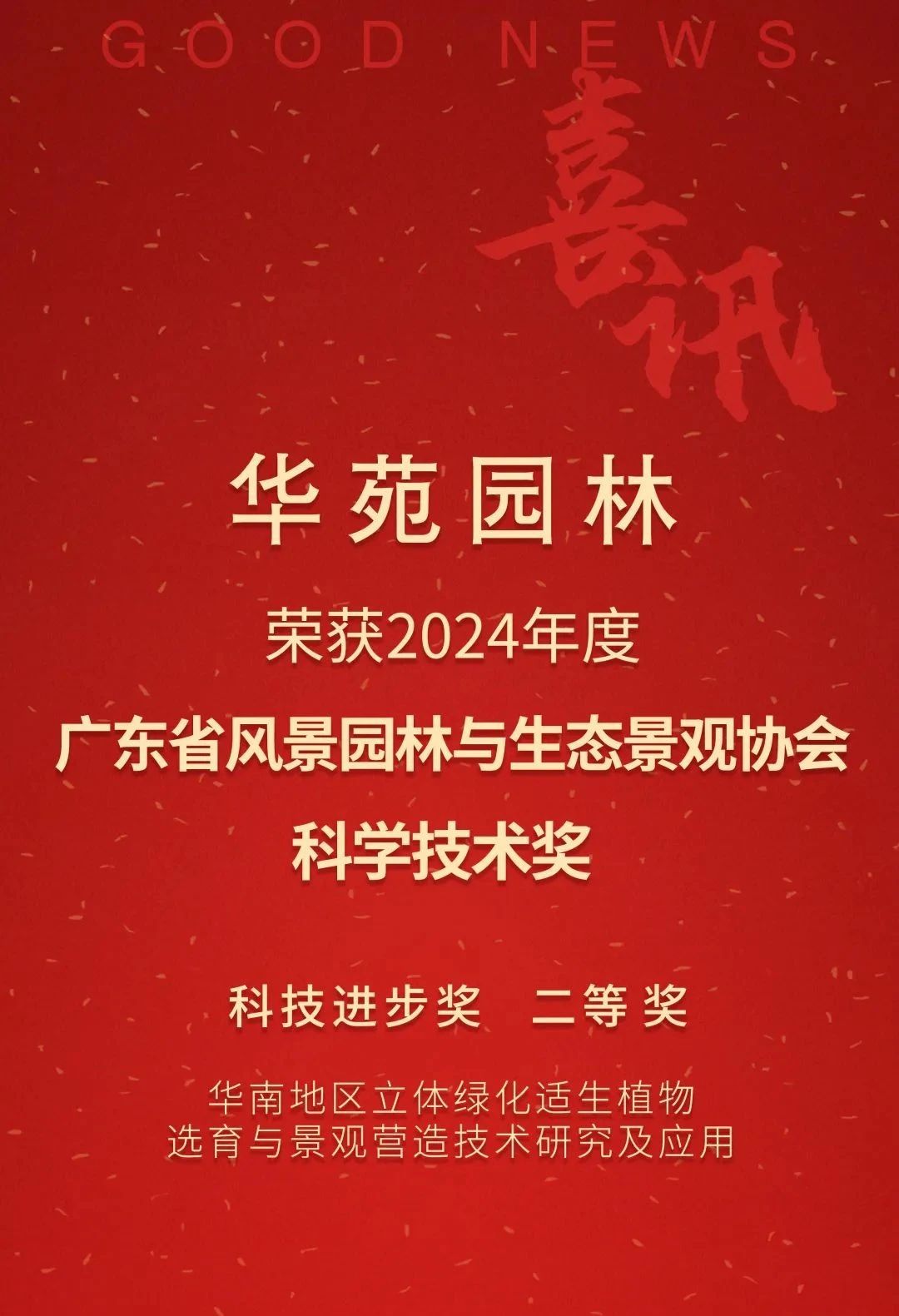 近日,廣東省風(fēng)景園林與生態(tài)景觀協(xié)會公布了2024年度科學(xué)技術(shù)獎的獲獎名單。其中,華苑園林所申報的“華南地區(qū)立體綠化適生植物選育與景觀營造技術(shù)研究及應(yīng)用”項目榮獲科技進步獎二等獎。